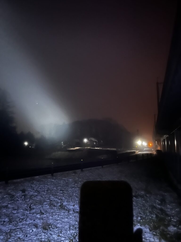 毎朝、こうやって歩いています。なんだか夜みたいですね(笑)